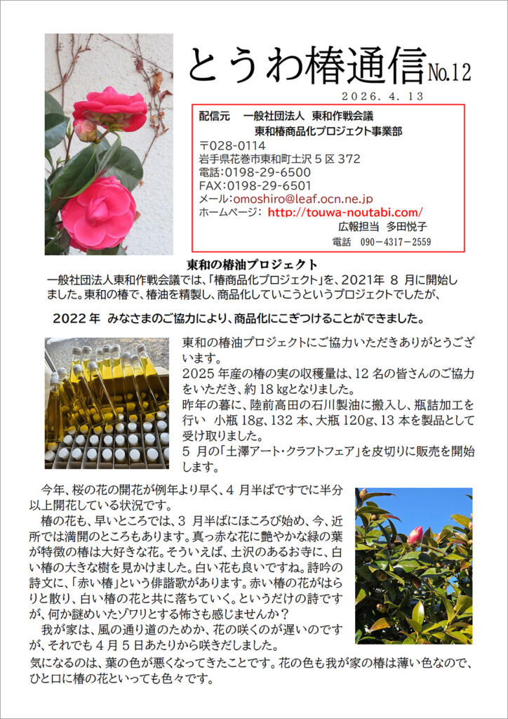 - とうわ椿通信 No.12みなさまこんにちは春が足早に過ぎていきます。椿の花も咲き始めました。 今年度最初の「椿通信」です。昨年度の報告が遅れて申し訳ありませんでした。 今年も良質の椿油がいっぱい採れるよう頑張ります。よろしくお願いします。 多田…