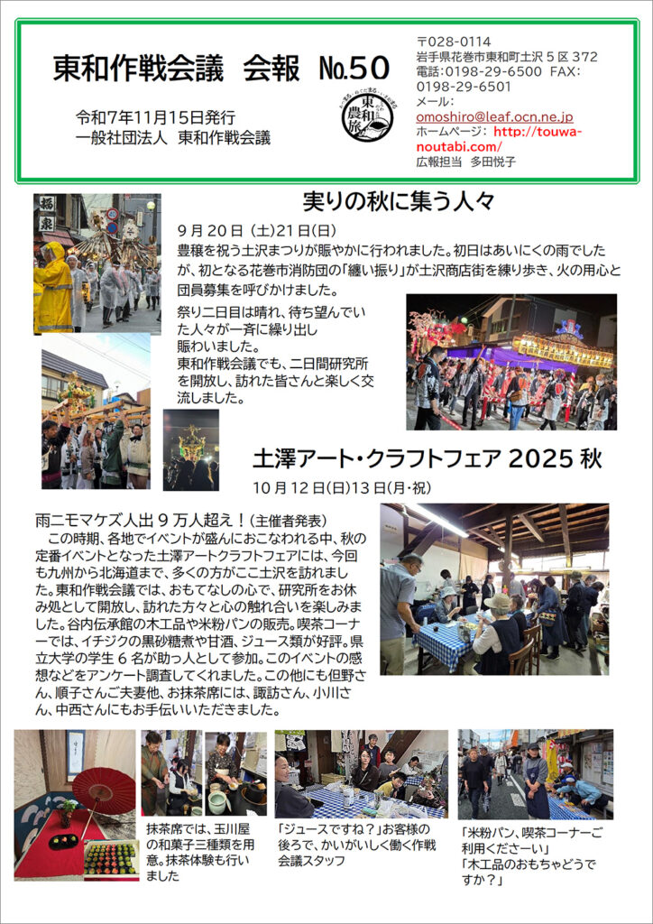 - 会報の最新号(50号)をアップしました会報49号は、『豊穣を祝う土沢まつり』『土澤アート・クラフトフェア2025秋』のレポートや『移住定住・空き家相 状況』の令和7年度上半期報告、その他のイベントレポートもあり、内容満載です。